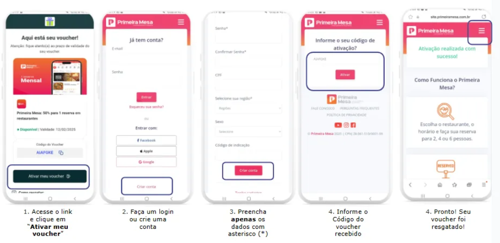 - Acessar o link recebido e clique em “Ativar Meu voucher”;https://site.primeiramesa.com.br/redeem,