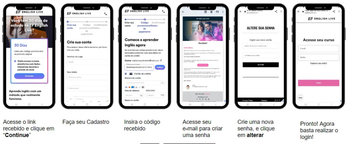 A EF English Live é uma escola online que oferece cursos de inglês para diversos níveis, com recursos interativos, aulas particulares ao vivo e aulas de conversação em grupo com professores nativos, a cada trinta minutos, sem agendamento prévio.