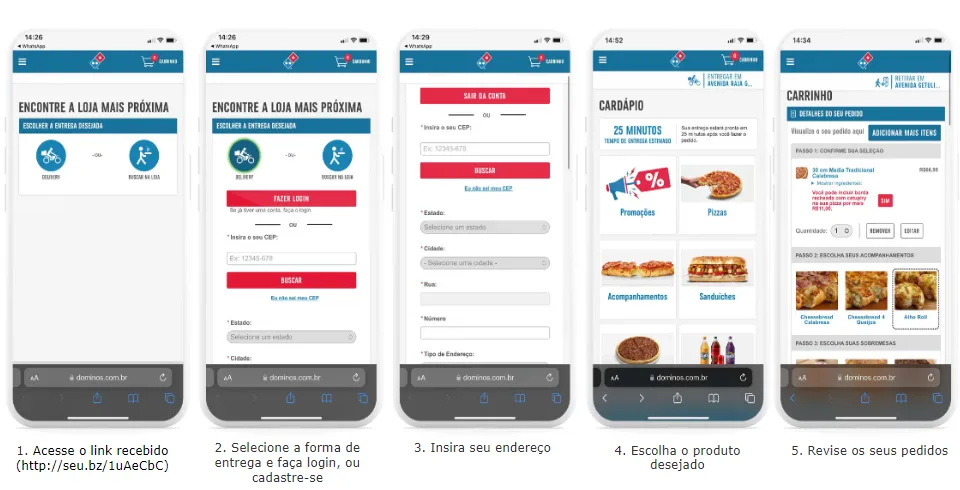 2.Selecione a forma de entrega e faça cadastro ou login; 3. Insira o endereço; 4. Escolha o produto desejado; 5. Revise o pedido;